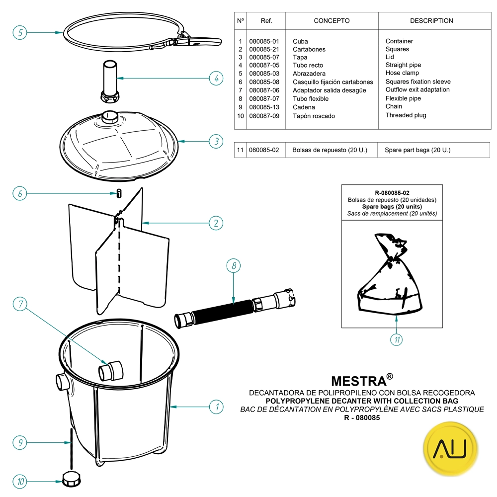 El decantador de plástico de Mestra tiene una capacidad de 19 litros. Fabricada con polipropileno de alta resistencia, esta unidad ha sido diseñada pensando en la facilidad de limpieza, permitiendo que los residuos se depositen directamente en una bolsa plástica para una gestión higiénica. Su tapa cuenta con un sellado hermético que bloquea eficazmente la propagación de olores desagradables. Además, su estructura compacta y dimensiones estratégicas la convierten en la opción ideal para instalar cómodamente bajo el fregadero.