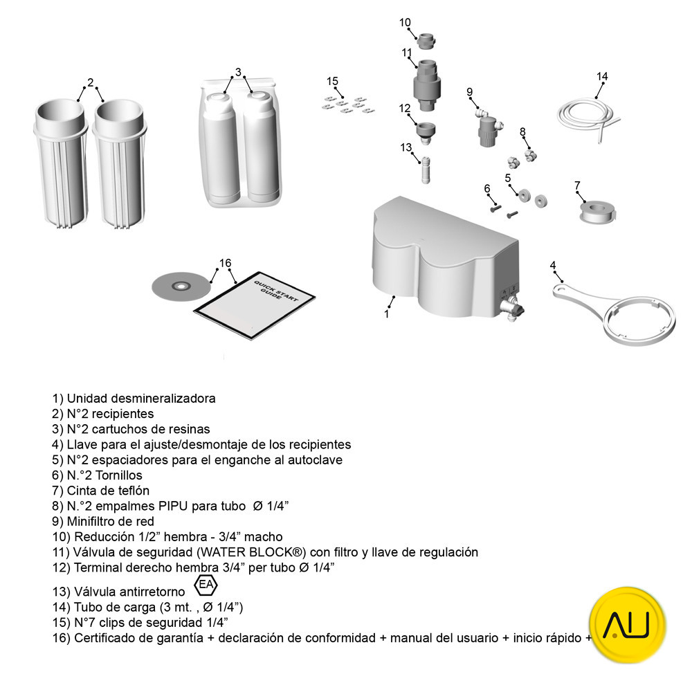 • Función: Su función principal es desmineralizar el agua. Esto significa que elimina minerales y otras impurezas del agua, asegurando una calidad óptima para su uso en autoclaves.