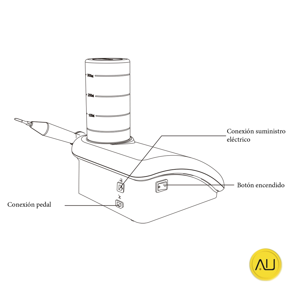 Cuenta con 8 puntas intercambiables y un depósito integrado para líquidos o medicamentos. Su diseño compacto y peso lo hacen ideal para clínicas con espacio reducido.