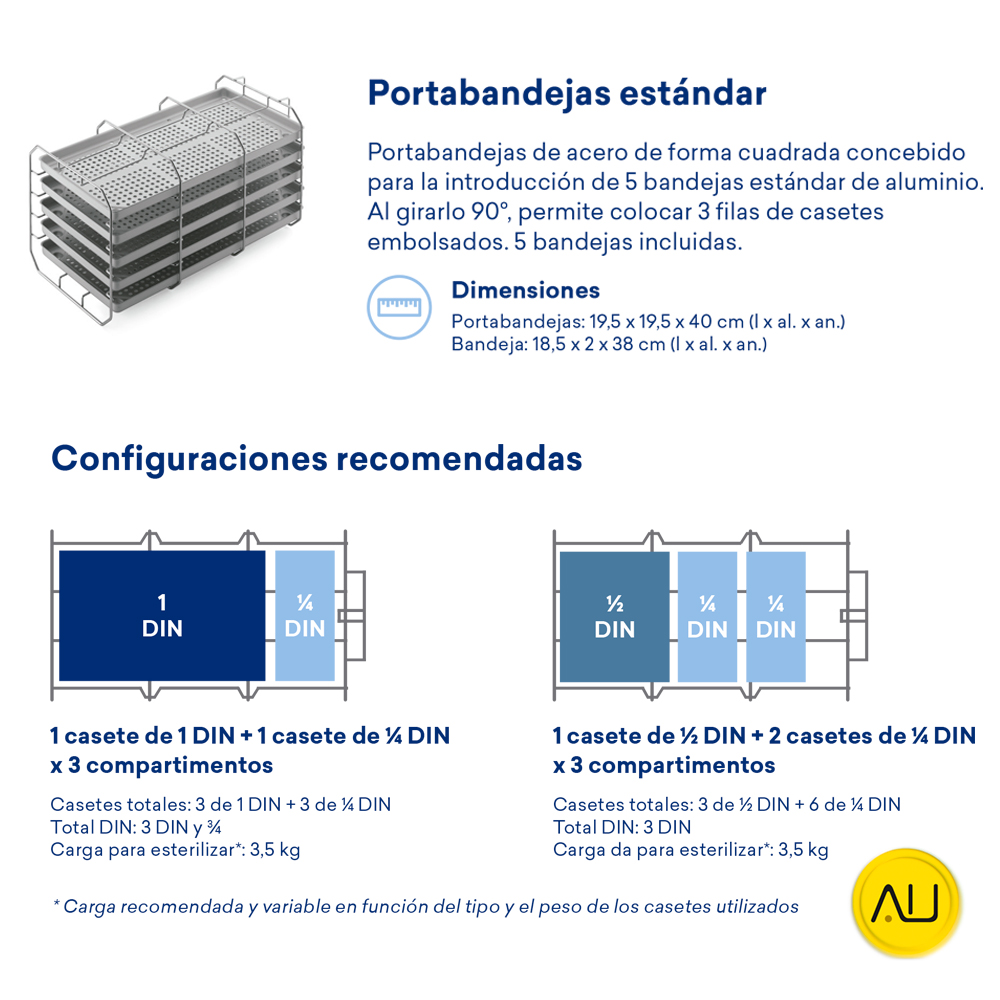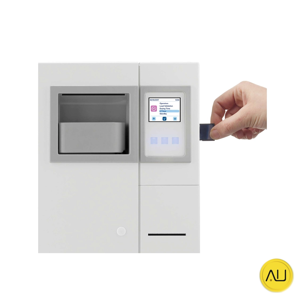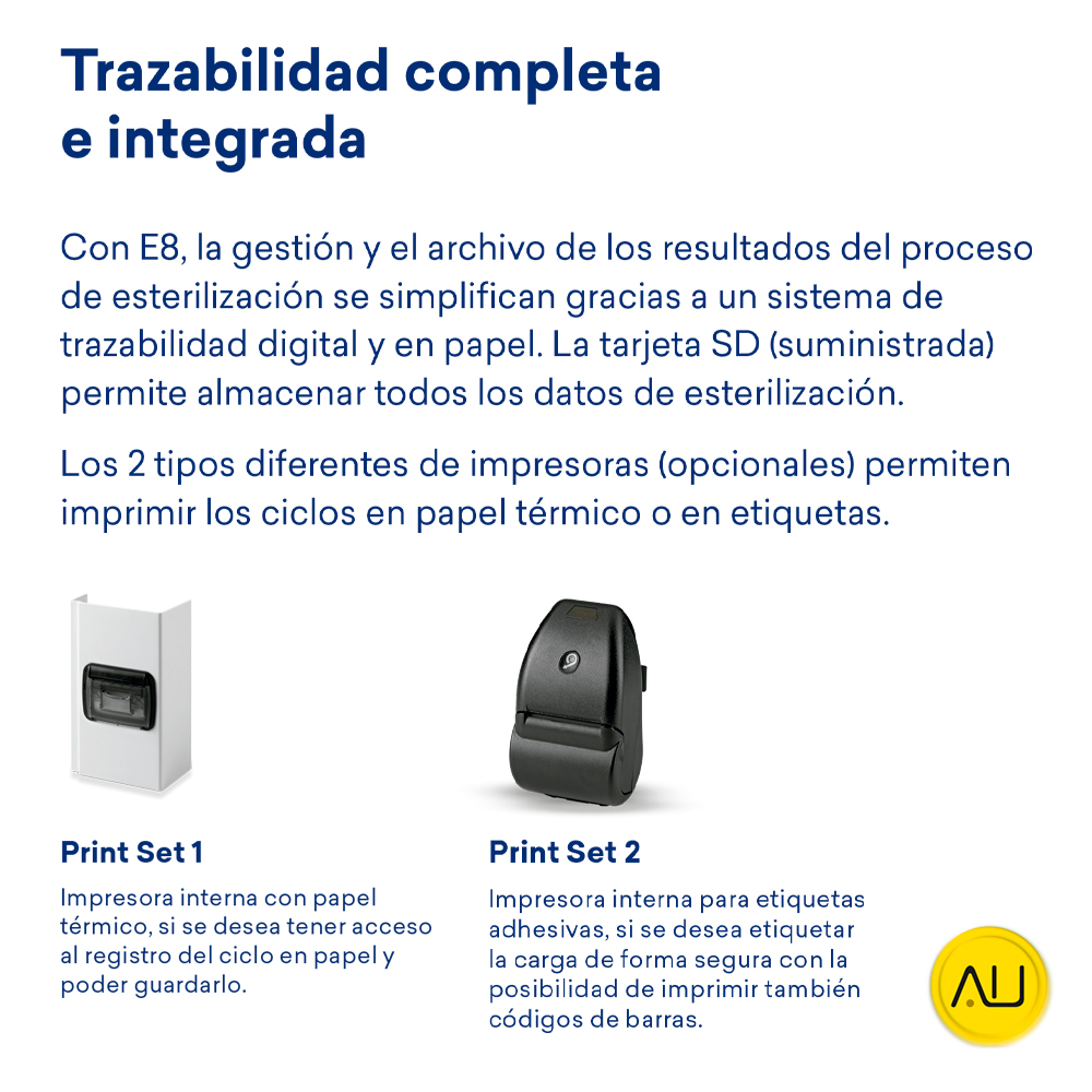 Está concebido para reducir al mínimo las dimensiones y para simplificar el trabajo de los operadores. El E8 es capaz de realizar 5 ciclos distintos de tipo B y también de tipo S y N (activadas mediante contraseñas).