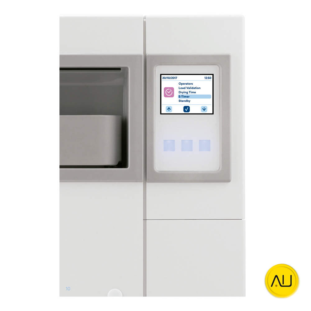 La función E-Timer puede programar el comienzo de los ciclos de esterilización y los test en el horario que desee, lo que le permite ahorrar tiempo y empezar la jornada laboral a pleno ritmo.