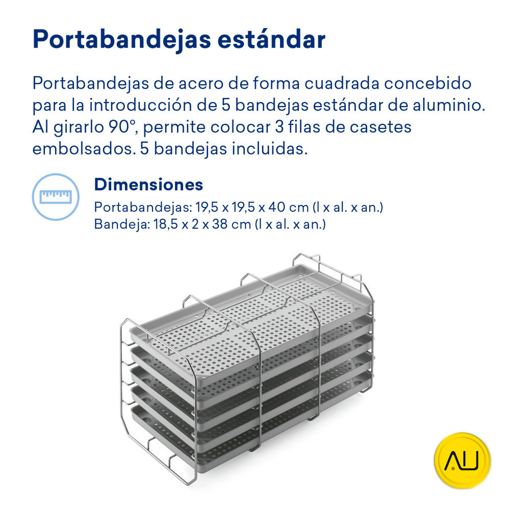 Capacidad de carga: La carga máxima para el E9 de 24 litros es de 6 Kg para materiales sólidos en bolsas. El E9 ofrece 4 soluciones para optimizar la carga a ser esterilizada según diferentes necesidades.
