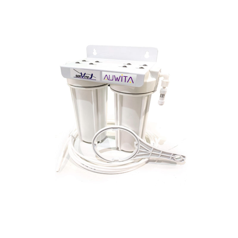 Sistema desmineralizador de agua especial para autoclaves, creado por los técnicos especialistas de Autoclav.es y SerViteJ. Equipado con dos cartuchos rellenables de 10” con resinas filtrantes de muy alta calidad.