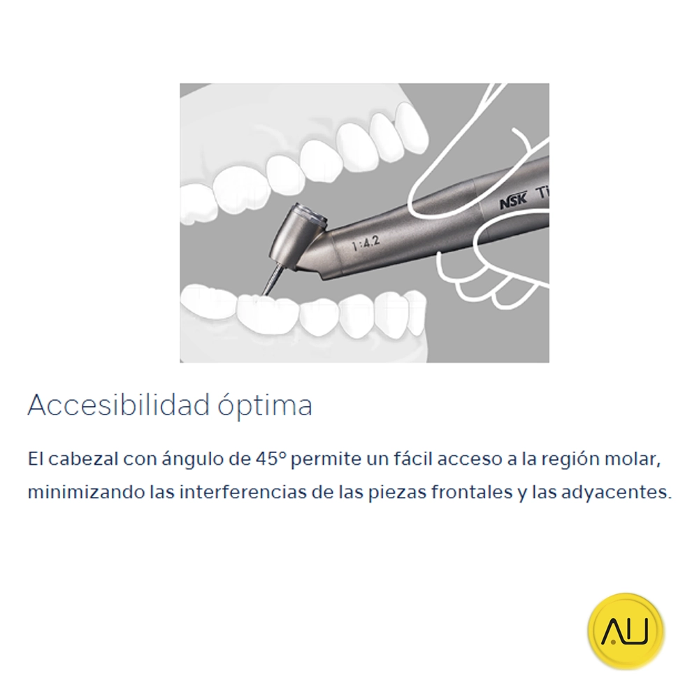 Accesibilidad Óptima: El cabezal con ángulo de 45º facilita el acceso a la región molar, minimizando las interferencias de las piezas frontales y adyacentes.