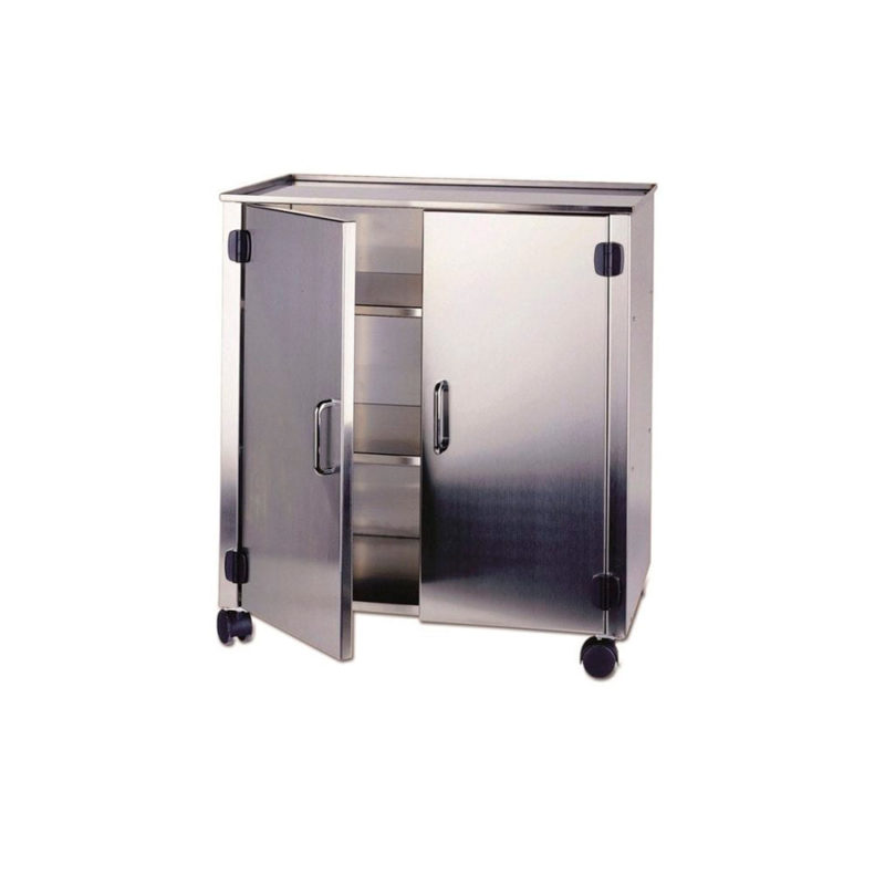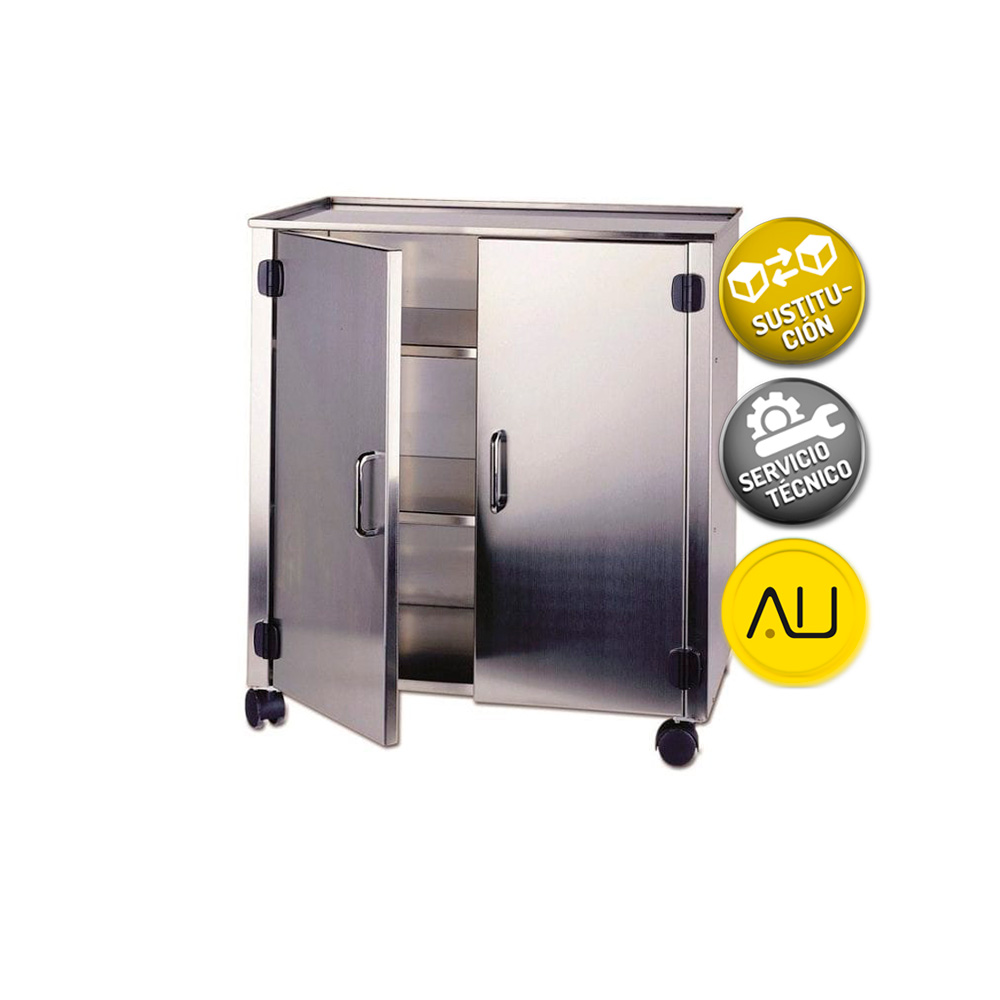 El mueble para lavadora construido totalmente en acero inoxidable es un accesorio, práctico, estético, duradero e inalterable dentro del laboratorio dental. Se han dispuesto en su interior tres baldas para poder guardar las muflas, bridas y cualquier otro material utilizado en los procesos de polimerización.