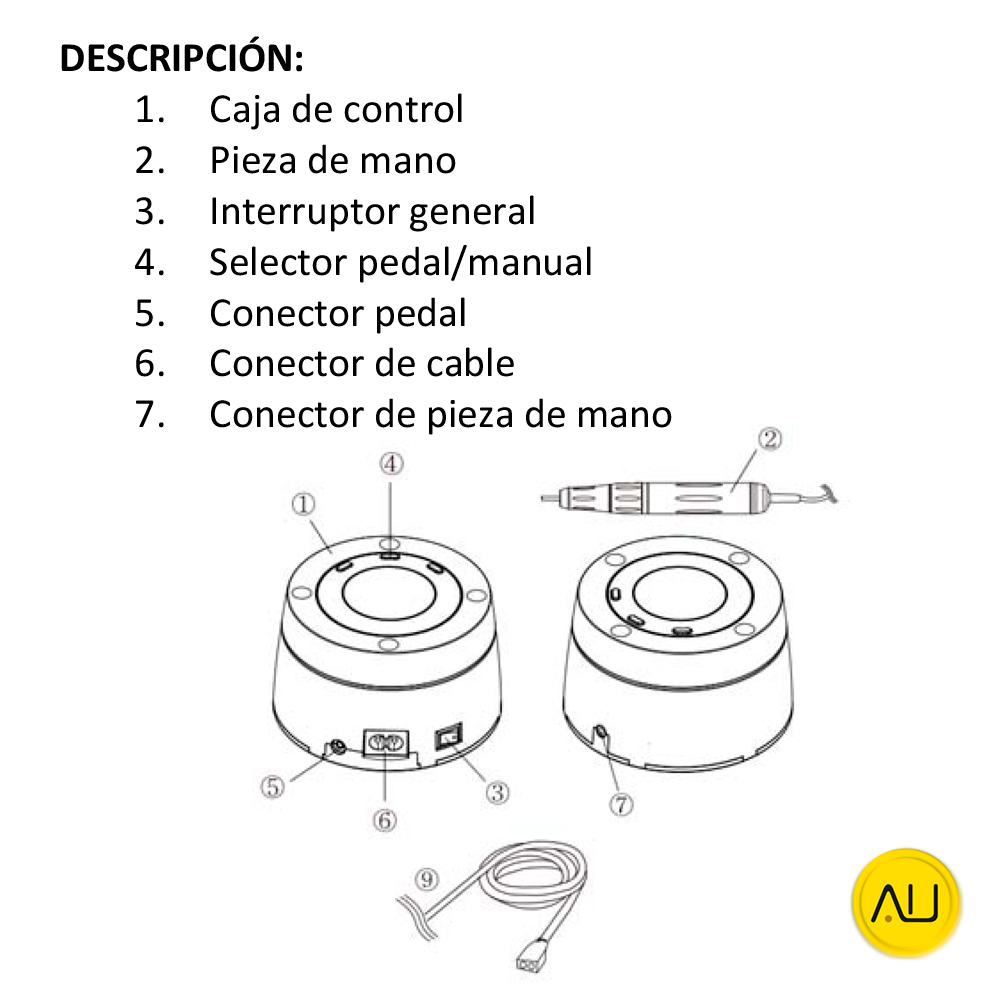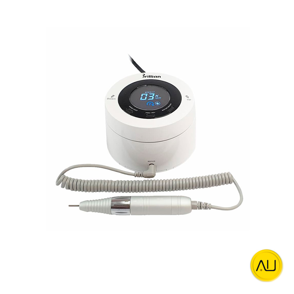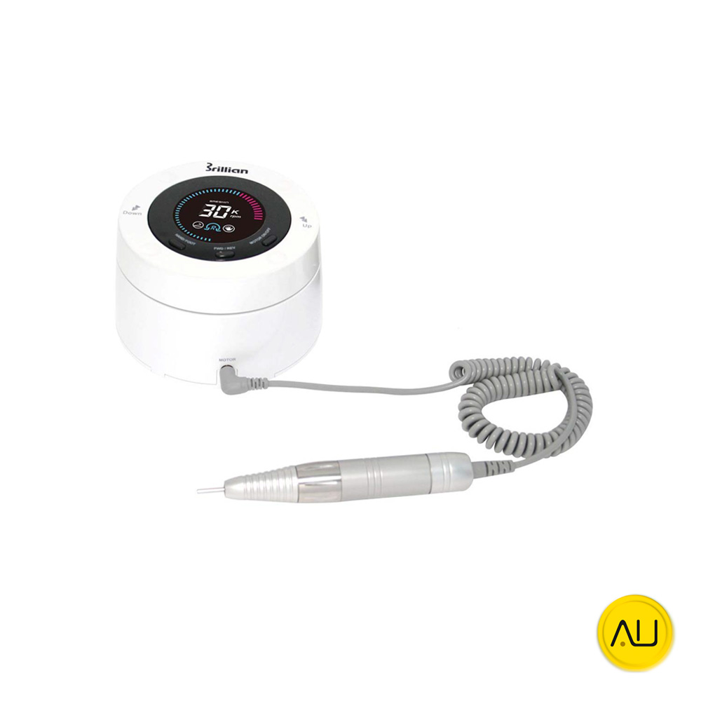 El micromotor Brillian B-100 de Abshot Tecnics es una herramienta de alta precisión diseñada exclusivamente para manicura de uñas. Disponible en dos elegantes colores, blanco y negro, este dispositivo alcanza hasta 30,000 rpm con una potencia de 50W y un torque de 2.9 Ncm. Su diseño circular único incluye una pantalla LCD a color que muestra información sobre las rpm y el torque, y permite el control digital de la velocidad. Además, cuenta con un pedal ON/OFF que puede funcionar con o sin pedal, y un sistema de desconexión por sobrecarga para mayor seguridad. La pieza de mano es ligera y precisa, lo que facilita su uso prolongado sin fatiga.