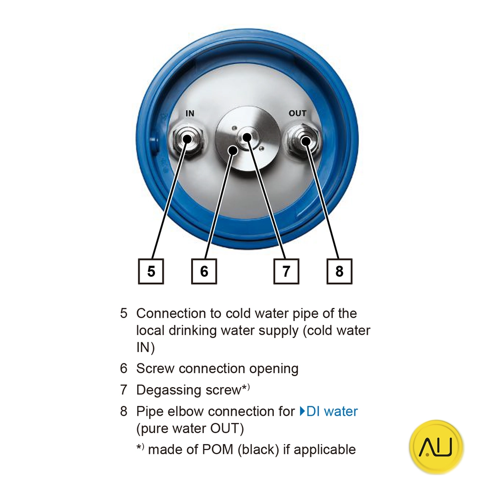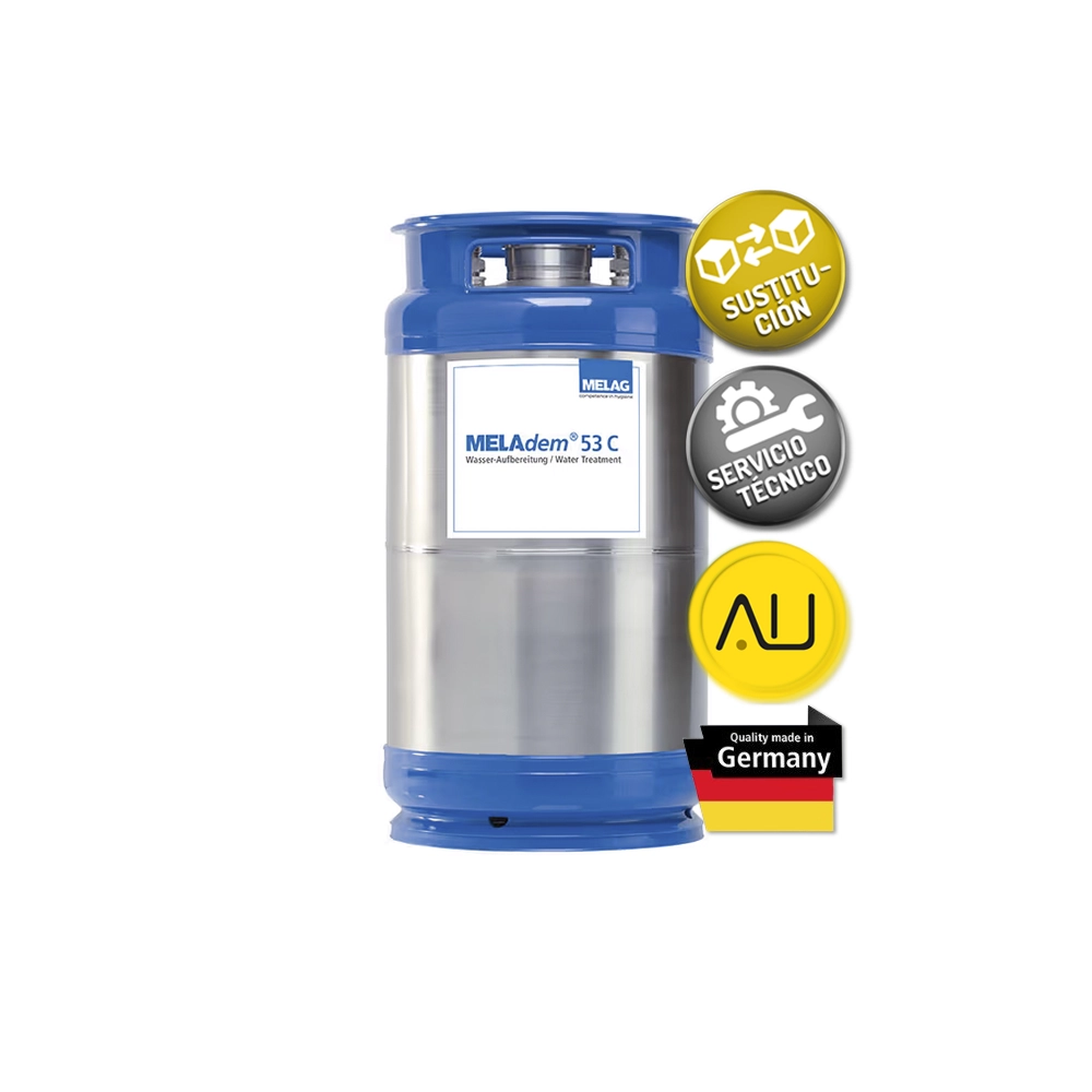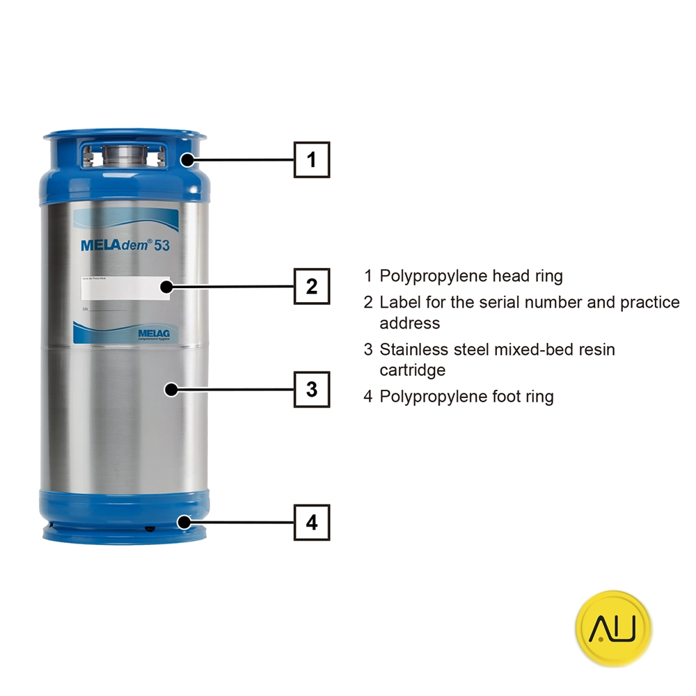 Para garantizar un rendimiento continuo, el equipo incluye dos cartuchos de gran capacidad con resina reutilizable. Uno de ellos puede conectarse directamente al aparato esterilizador o a la unidad de limpieza MELAtherm, ofreciendo flexibilidad y eficiencia en la gestión del agua tratada.